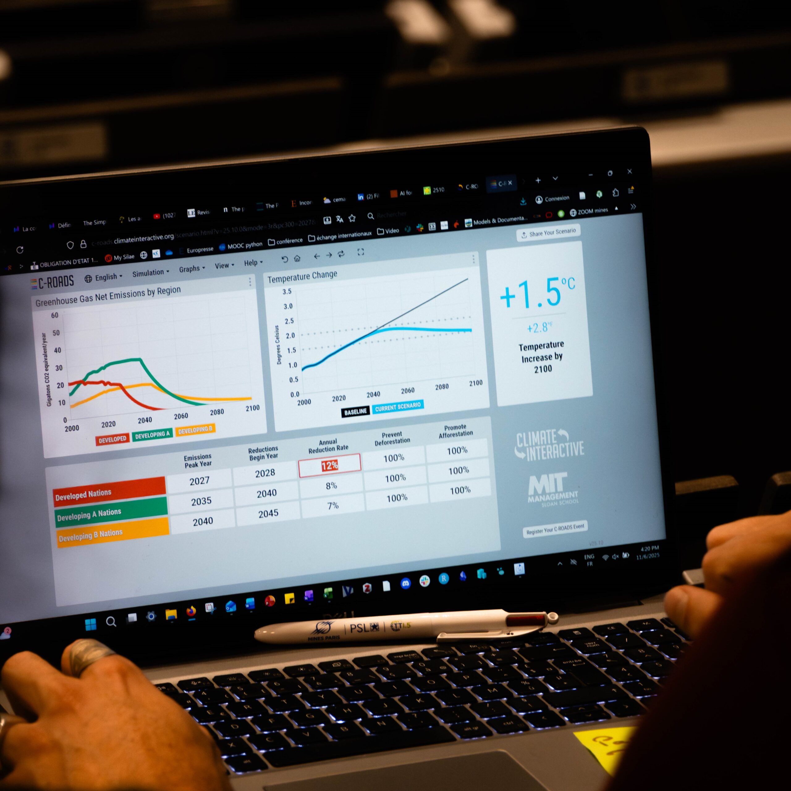 En 2e partie de journée, Alain Burr (CEMEF Mines Paris – PSL – CNRS UMR7635) a partagé son expérience de créateur de start-up et Sandrine Selosse (CMA) a proposé un jeu de rôles – à l’aide d’un outil de simulation – basé sur les négociations pour le changement climatique des United Nations.